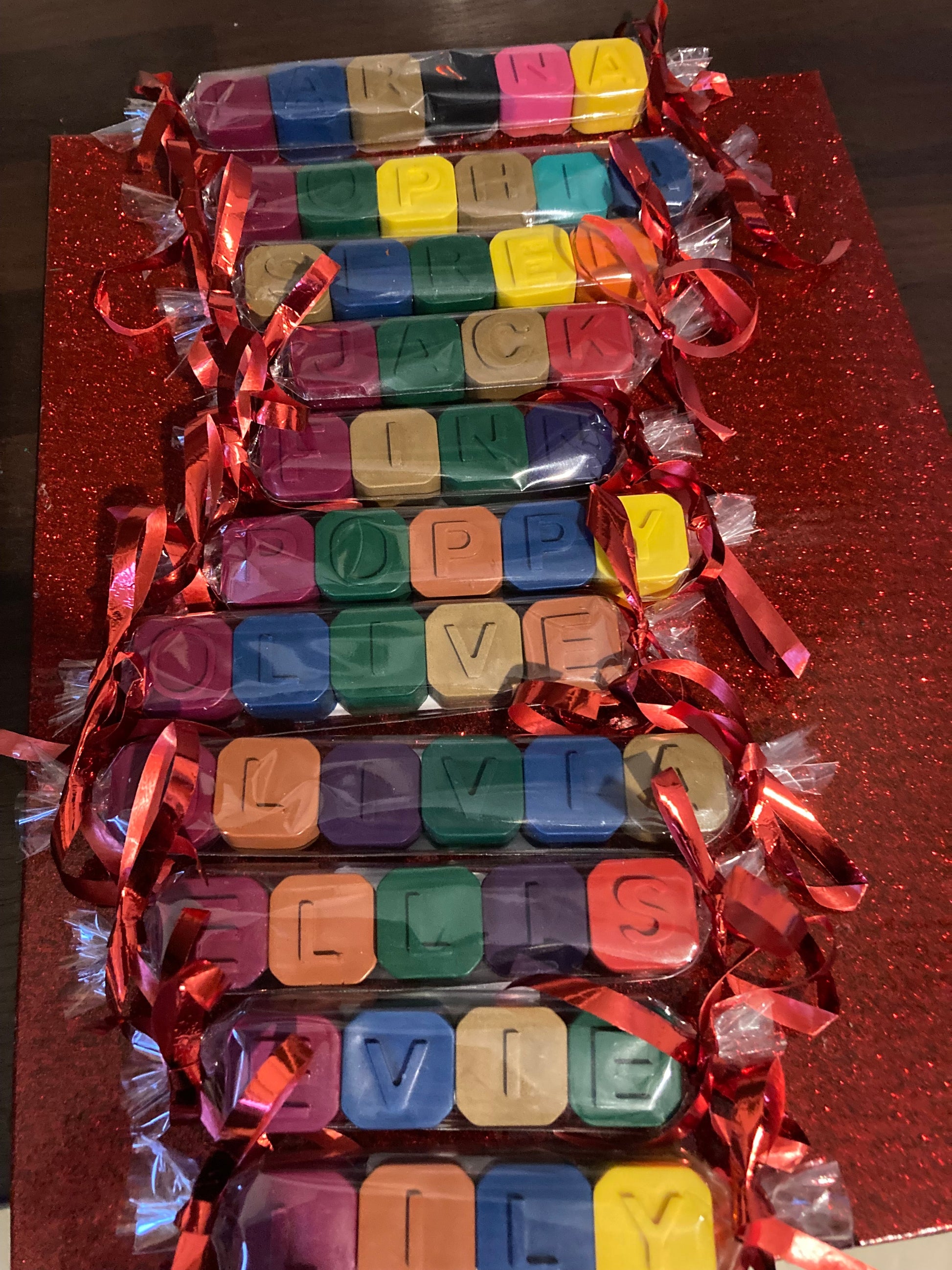 colours are chosen at random for crayons and will be a mixture of light and dark colours. There may be frosting/ a small bit of another colour in the letter due to it being handmade but doesn’t affect the quality